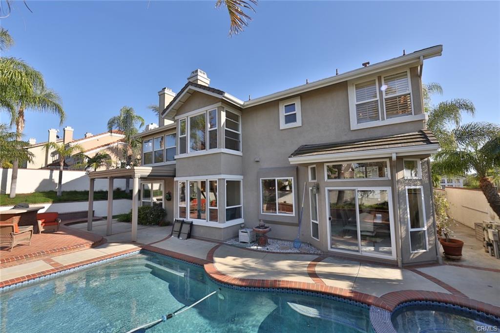 Wonderful Eastlake Village Estate Home with private Pool & Spa. It situated at a quiet and private cul-de-sac and features 4 bedrooms 3 baths with 1 bedroom and 1.5 bath downstairs and a big bonus room upstairs which can be used as the 5th bedroom/office/entertaining room. Richly appointed with quality upgrades throughout and immaculate top to bottom. Interior is dramatic yet comfortable with granite floors and graceful curving staircase, formal living room offers soaring two story ceilings and an elegant oversized fireplace., very bright and airy, dining room is a perfect place for family and friends, kitchen is nicely done in granite counters, maple cabs, stainless appliances, built in ref, center island, nook, all open to family room with stacked stone fireplace. Main floor mini suite with shower, additional powder downstairs for the guest as well. Master suite is immense with vaulted ceilings, fireplace, retreat, 3 closet, granite floor in bath, jetted tub, separate shower, dual vanities. 2 more secondary bedrooms, hall bath remodeled, bonus room with peek a boo view, fireplace and shutters, bar. Backyard features open patio, black bottom pool and spa, built-in BBQ Bar, side yard is a max of 12 x 45′ gated RV parking, individual laundry room and 3 car garage. Long list of upgrades. Low HOA dues to enjoy all East Lake amenities, including community pools, spas, clubhouse, gym, tennis courts and boating & fishing on 15-Acre lake! Award-Winning School District. DONT MISS THIS PROPERTY!!